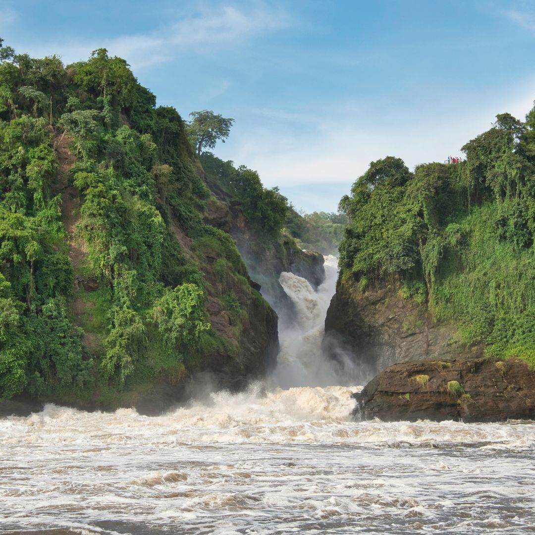 Home to the powerful Murchison Falls where the Nile River crashes through a narrow gorge before flowing into a wide river basin filled with wildlife.